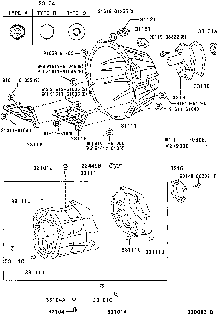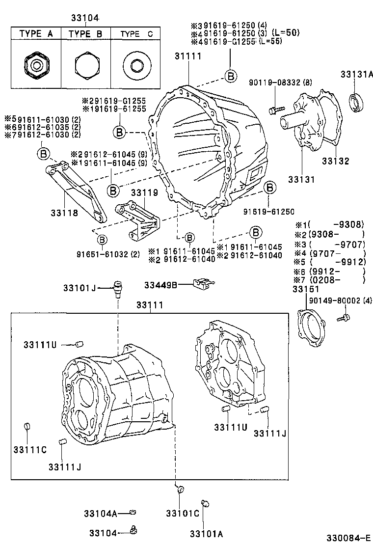РЕГІОН: Європа > Автомобіль: HIACE VAN,COMMUTER 198908 200602 A2 > Модель: LH104R-BFMRS > Група: ТРАНСМІСІЯ, ПІДВІСКА (2) > Підгрупа: CLUTCH HOUSING & TRANSMISSION CASE (MTM) (3302)
